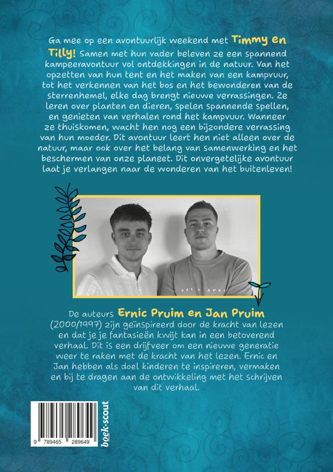 Ga mee op een avontuurlijk weekend met Timmy en Tilly! Samen met hun vader beleven ze een spannend kampeeravontuur vol ontdekkingen in de natuur. Van het opzetten van hun tent en het maken van een kampvuur, tot het verkennen van het bos en het bewonderen van de sterrenhemel, elke dag brengt nieuwe verrassingen. Ze leren over planten en dieren, spelen spannende spellen, en genieten van verhalen rond het kampvuur. Wanneer ze thuiskomen, wacht hen nog een bijzondere verrassing van hun moeder. Dit avontuur leert hen niet alleen over de natuur, maar ook over het belang van samenwerking en het beschermen van onze planeet. Dit onvergetelijke avontuur laat je verlangen naar de wonderen van het buitenleven!