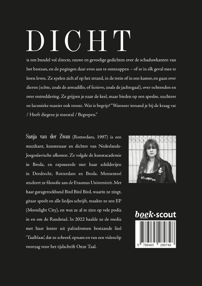 Dicht is een bundel vol directe, rauwe en gevoelige gedichten over de schaduwkanten van het bestaan, en de pogingen daar even aan te ontsnappen – of er in elk geval mee te leren leven. Ze spelen zich af op het strand, in de trein of in een kamer, en gaan over dieren (echte, zoals de armadillo, of fictieve, zoals de jachtegaal), over ochtenden en over ontreddering. Ze grijpen je naar de keel, maar bieden op een speelse, nuchtere en laconieke manier ook troost. Wat is begrip? “Wanneer iemand je bij de kraag vat / Heeft diegene je meestal / Begrepen.”
