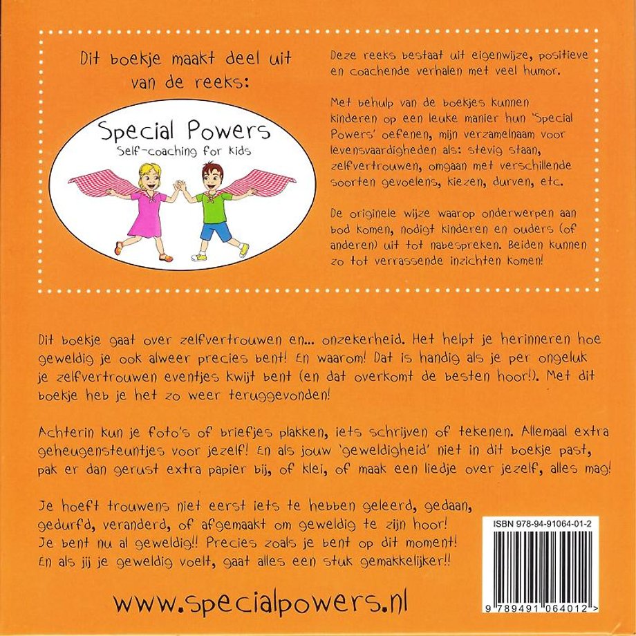 Dit is het 1e boekje uit de reeks 'Special Powers - Self-coaching for Kids'. De reeks bestaat uit eigenwijze, positieve en coachende verhalen met veel humor. Met behulp van de boekjes kunnen kinderen op een leuke manier hun 'Special Powers' oefenen, mijn verzamelnaam voor levensvaardigheden als: stevig staan, zelfvertrouwen hebben, omgaan met verschillende soorten gevoelens, kiezen, durven, etc. De verhalen gaan over situaties waar ieder kind wel eens mee te maken heeft, direct of indirect. Niet stigmatiserend dus!