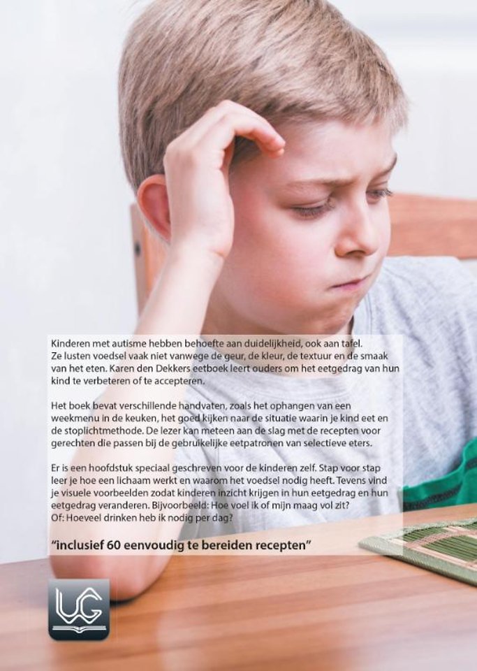 Kinderen met autisme hebben behoefte aan duidelijkheid, ook aan tafel. Ze lusten voedsel vaak niet vanwege de geur, de kleur, de textuur en de smaak van het eten. Karen den Dekkers eetboek leert ouders om het eetgedrag van hun kind te verbeteren of te accepteren.