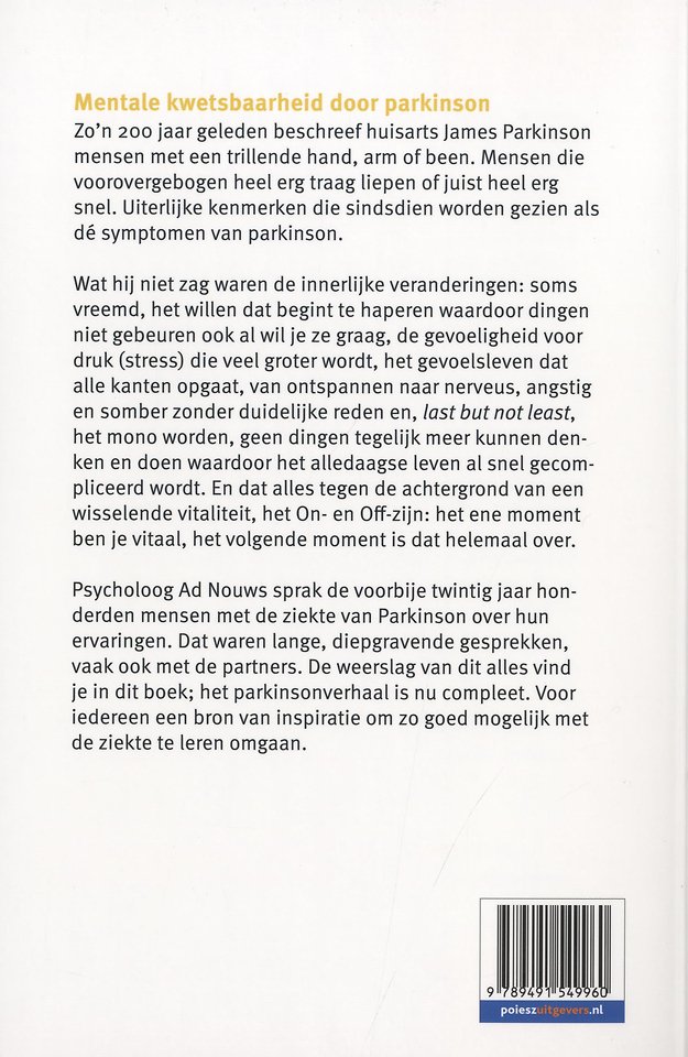Psycholoog Ad Nouws sprak de voorbije twintig jaar honderden mensen met de ziekte van Parkinson over hun ervaringen. Dat waren lange, diepgravende gesprekken, vaak ook met de partners. De weerslag van dit alles vind je in dit boek; het parkinsonverhaal is nu compleet. Voor iedereen een bron van inspiratie om zo goed mogelijk met de ziekte te leren omgaan.