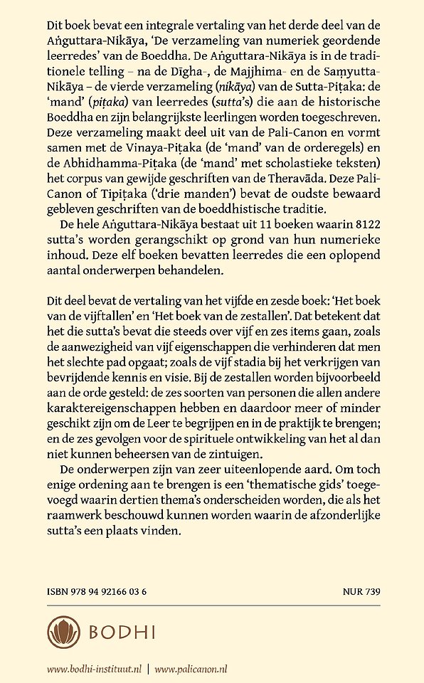 De Aṅguttara-Nikāya is in de traditionele telling – na de Dīgha-, de Majjhima-en de Saṃyutta-Nikāya – de vierde verzameling (nikāya) van de Sutta-Piṭaka: de ‘mand’ (piṭaka) van leerredes (sutta’s) die aan de historische Boeddha en zijn belangrijkste leerlingen worden toegeschreven. Deze verzameling maakt deel uit van de Pali-Canon en vormt samen met de Vinaya-Piṭaka (de ‘mand’ van de orderegels) en de Abhidhamma-Piṭaka (de ‘mand’ met scholastieke teksten) het corpus van gewijde geschriften van de Theravāda. Deze Pali-Canon of Tipiṭaka (‘drie manden’) bevat de oudste bewaard gebleven geschriften van de boeddhistische traditie. De hele Aṅguttara-Nikāya bestaat uit 11 boeken waarin 8122 sutta’s worden gerangschikt op grond van hun numerieke inhoud. Deze elf boeken bevatten leerredes die een oplopend aantal onderwerpen behandelen. Dit deel bevat de vertaling van het vijfde en zesde boek: ‘Het boek van de vijftallen’ en ‘Het boek van de zestallen’. Dat betekent dat het die sutta’s bevat die steeds over vijf en zes items gaan, zoals de vijf redelijke punten van kritiek waaraan een monnik of non zich blootstelt, als hij of zij de leerweg de rug toekeert en terugkeert naar het lagere leven; zoals de aanwezigheid van vijf eigenschappen die verhinderen dat men het slechte pad opgaat; zoals de vijf stadia bij het verkrijgen van bevrijdende kennis en visie. Bij de zestallen worden bijvoorbeeld aan de orde gesteld: de zes soorten van personen die allen andere karaktereigenschappen hebben en daardoor meer of minder geschikt zijn om de Leer te begrijpen en in de praktijk te brengen; en de zes gevolgen voor de spirituele ontwikkelingvan het al dan niet kunnen beheersen van de zintuigen. Zoals men ziet, zijn de onderwerpen van zeer uiteenlopende aard. Om toch enige ordening aan te brengen in het grote aantal sutta's is een 'thematische gids' toegevoegd waarin dertien thema's onderscheiden worden, die als het raamwerk beschouwd kan worden waarin de afzonderlijke sutta's een plaats vinden.