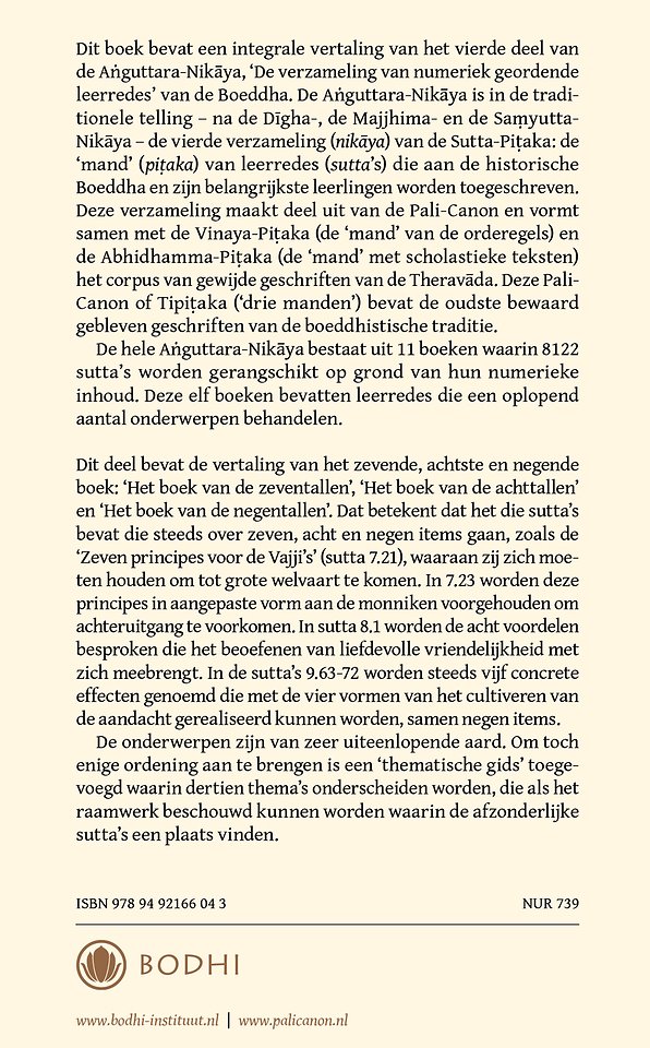 Dit deel bevat de vertaling van het zevende, achtste en negende boek: ‘Het boek van de zeventallen’, ‘Het boek van de achttallen’ en ‘Het boek van de negentallen’. Dat betekent dat het die sutta’s bevat die steeds over zeven, acht en negen items gaan, zoals de ‘Zeven principes voor de Vajji’s’ (sutta 7.21), waaraan zij zich moe-ten houden om tot grote welvaart te komen. In 7.23 worden deze principes in aangepaste vorm aan de monniken voorgehouden om achteruitgang te voorkomen. In sutta 8.1 worden de acht voordelen besproken die het beoefenen van liefdevolle vriendelijkheid met zich meebrengt. In de sutta’s 9.63-72 worden steeds vijf concrete effecten genoemd die met de vier vormen van het cultiveren van de aandacht gerealiseerd kunnen worden, samen negen items.