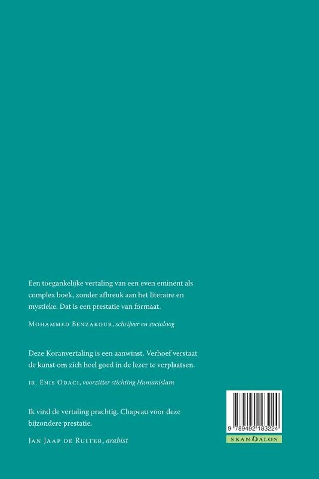 ENIS ODACI, voorzitter stichting Humanislam: 'Deze Koranvertaling is een aanwinst. Verhoef verstaat de kunst om zich heel goed in de lezer te verplaatsen.' JAN JAAP DE RUITER, arabist: 'Ik vind de vertaling prachtig. Chapeau voor deze bijzondere prestatie.'