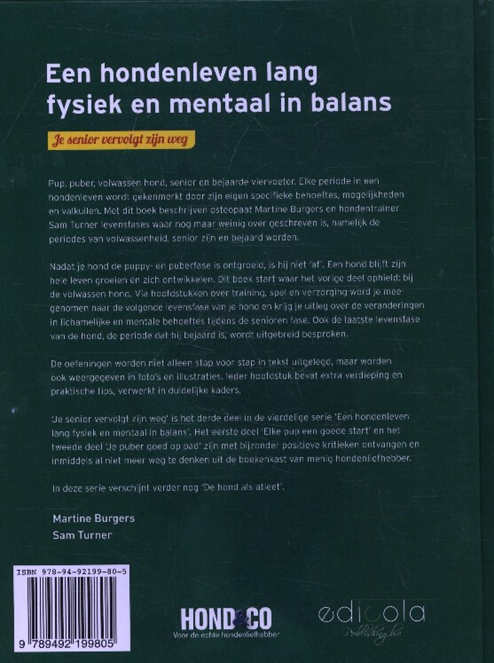 Nadat je hond de puppy- en puberfase is ontgroeid, is hij niet 'af'. Een hond blijft zijn hele leven groeien en zich ontwikkelen. Dit boek start waar het vorige deel ophield: bij de volwassen hond. Via hoofdstukken over training, spel en verzorging word je meegenomen naar de volgende levensfase van je hond en krijg je uitleg over de veranderingen in lichamelijke en mentale behoeftes tijdens de senior fase. Ook de laatste levensfase van de hond, de periode dat hij bejaard is, wordt uitgebreid besproken.