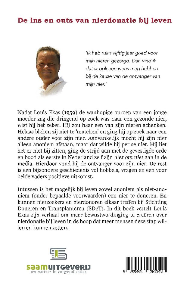 Intussen is het mogelijk bij leven zowel anoniem als niet-anoniem (onder bepaalde voorwaarden) een nier te doneren. En kunnen nierzoekers en nierdonoren elkaar treff en bij Stichting Doneren en Transplanteren (SDeT). In dit boek vertelt Louis Ekas zijn verhaal om meer bewustwordinging te creëren over nierdonatie bij leven in de hoop dat meer mensen deze stap willen en kunnen zetten.