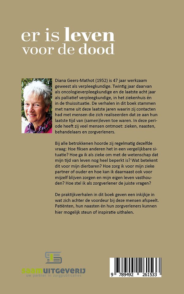 Diana Geers-Mathot (1952) is 47 jaar werkzaam geweest als verpleegkundige. Twintig jaar daarvan als oncologieverpleegkundige en de laatste acht jaar als palliatief verpleegkundige, in het ziekenhuis én in de thuissituatie. De verhalen in dit boek stammen met name uit deze laatste jaren waarin zij contacten had met mensen die zich realiseerden dat ze aan hun