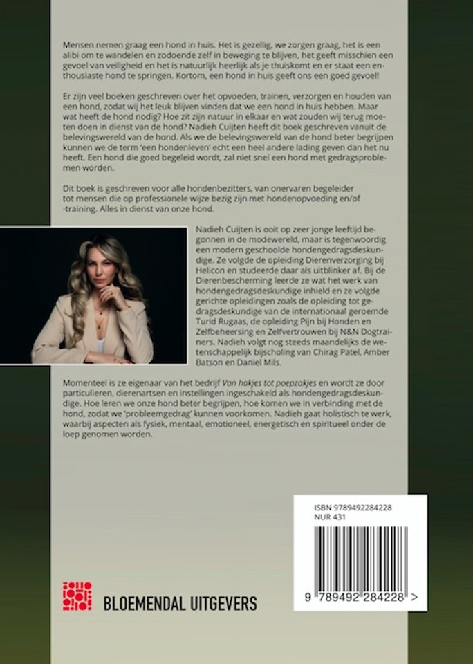 Dit boek is geschreven voor alle hondenbezitters, van onervaren begeleider tot mensen die op professionele wijze bezig zijn met hondenopvoeding en/of-training. Alles in dienst van onze hond. Nadieh Cuijten is ooit op zeer jonge leeftijd begonnen in de modewereld, maar is tegenwoordig een modern geschoolde hondengedragsdeskundige. Ze volgde de opleiding Dierenverzorging bij Helicon en studeerde daar als uitblinker af. Bij de Dierenbescherming leerde ze wat het werk van hondengedragsdeskundige inhield en ze volgde gerichte opleidingen zoals de opleiding tot gedragsdeskundige van de internationaal geroemde Turid Rugaas, de opleiding Pijn bij Honden en Zelfbeheersing en Zelfvertrouwen bij N&N Dogtrainers.