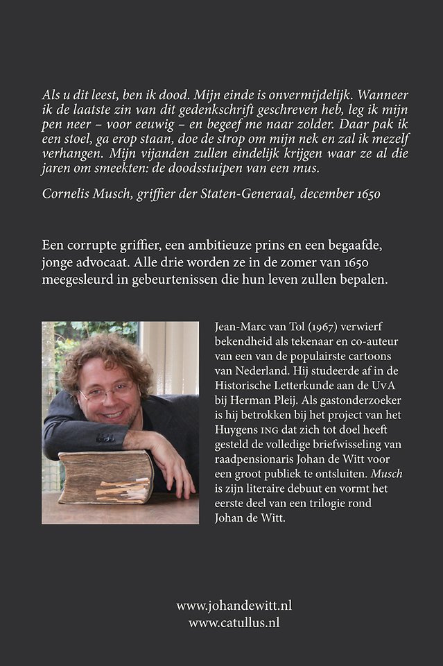 Met historische gegevens als basis weet Jean-Marc van Tol in deze wervelende en intrigerende roman naast de ondergang van Cornelis Musch (1593-1650), de opkomst van Johan de Witt (1625-1672) op kleurrijke wijze tot leven te wekken. Hij doet dit aan de hand van memoires, getuigenissen, brieven en andere egodocumenten van verschillende hoofdpersonen uit het verhaal, onder wie (naast Musch en De Witt) Willem II, Frederik van Dohna, Jacob Cats en Constantijn Huygens. Een fascinerende vertelling voor iedereen die van vaderlandse geschiedenis houdt.