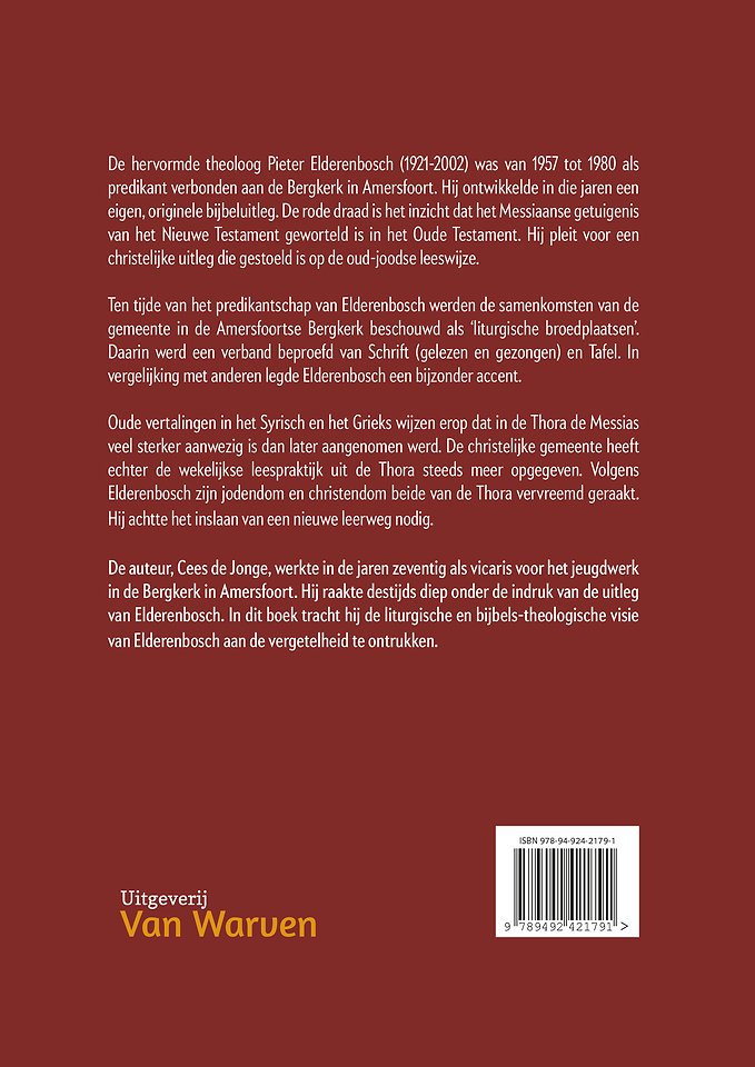 De hervormde theoloog Pieter Elderenbosch (1921-2002) was van 1957 tot 1980 als predikant verbonden aan de Bergkerk in Amersfoort. Hij ontwikkelde in die jaren een eigen, originele bijbeluitleg. De rode draad is het inzicht dat het Messiaanse getuigenis van het Nieuwe Testament geworteld is in het Oude Testament. Hij pleit voor een christelijke uitleg die gestoeld is op de oud-joodse leeswijze.
