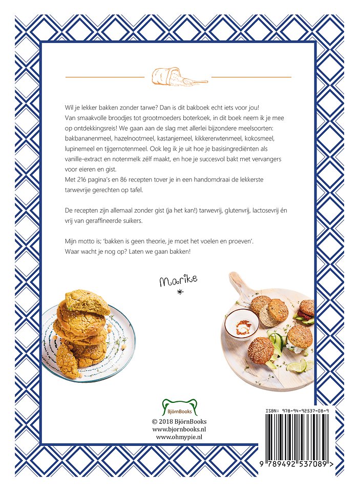 Oh My Pie! Ben je er ook van overtuigd dat tarwe niet goed is voor je buik? Maar wil je toch je boterham of snackreep niet missen? Dan is het boek Bakken Zonder Tarwe een aanwinst voor jouw aanrecht. Marike Bol (bekend van de foodblog Oh My Pie!) neemt je mee op ontdekkingstocht met nieuwe(re) meelsoorten. Ze leert je heerlijke broodjes maken van bakbananenmeel, snackrepen met tijgernotenmeel en ook de trucjes hoe je tarwevrij brood toch elastisch en smakelijk maakt. Want tarwevrij brood hoeft nu eenmaal niet korrelig te zijn en bij de eerste hap uit elkaar te vallen. Ook is er in dit boek ruimte voor koekjes, hartige happers en nog veel meer lekkers. Maak bv eens eigen notenmelk. Super makkelijk en erg smaakvol! Ga mee op ontdekkingsreis met Marike Bol en tover zelf de lekkerste creaties op tafel.