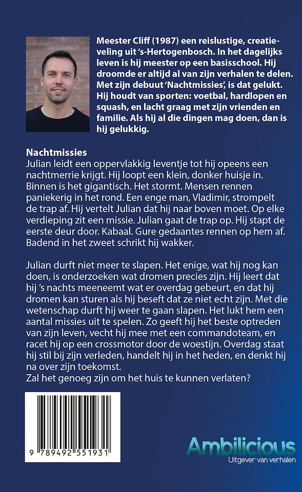 Meester Cliff (1987) een reislustige, creatieveling uit ‘s-Hertogenbosch. In het dagelijks leven is hij meester op een basisschool. Hij droomde er altijd al van zijn verhalen te delen. Met zijn debuut ‘Nachtmissies’, is dat gelukt. Hij houdt van sporten: voetbal, hardlopen en squash, en lacht graag met zijn vrienden en familie. Als hij al die de dingen mag doen, dan is hij gelukkig.