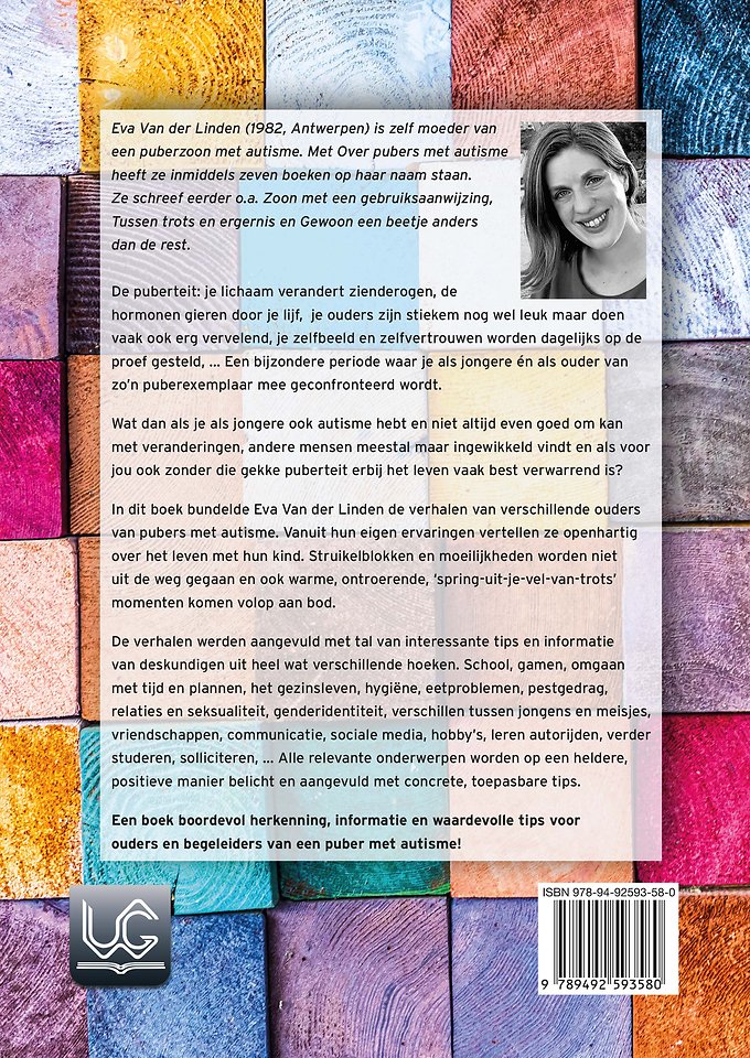 In dit boek bundelde Eva Van der Linden de verhalen van verschillende ouders van pubers met autisme. Vanuit hun eigen ervaringen vertellen ze openhartig over het leven met hun kind. Struikelblokken en moeilijkheden worden niet uit de weg gegaan en ook warme, ontroerende, ‘spring-uit-je-vel-van-trots’ momenten komen volop aan bod.