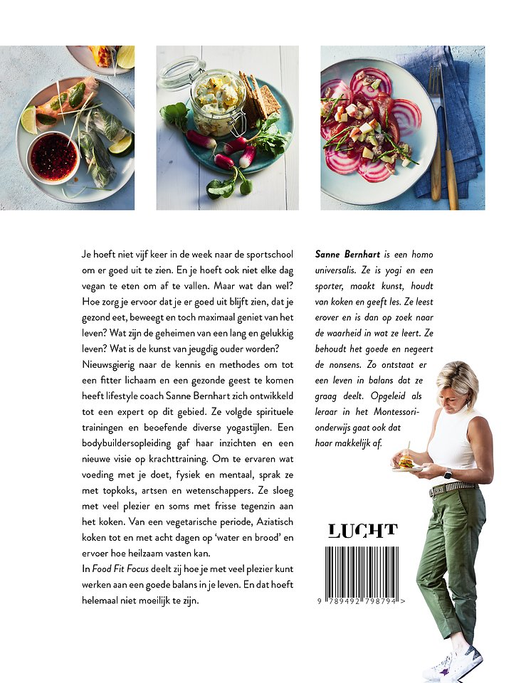 Nieuwsgierig naar de kennis en methodes om tot een fitter lichaam en een gezonde geest te komen heeft lifestyle coach Sanne Bernhart zich ontwikkeld tot een expert op dit gebied. Ze volgde spirituele trainingen en beoefende diverse yogastijlen. Een bodybuildersopleiding gaf haar inzichten en een nieuwe visie op krachttraining. Om te ervaren wat voeding met je doet, fysiek en mentaal, sprak ze met topkoks, artsen en wetenschappers. Ze sloeg met veel plezier en soms met frisse tegenzin aan het koken. Van een vegetarische periode, Aziatisch koken tot en met acht dagen op ‘water en brood’ en ervoer hoe heilzaam vasten kan.