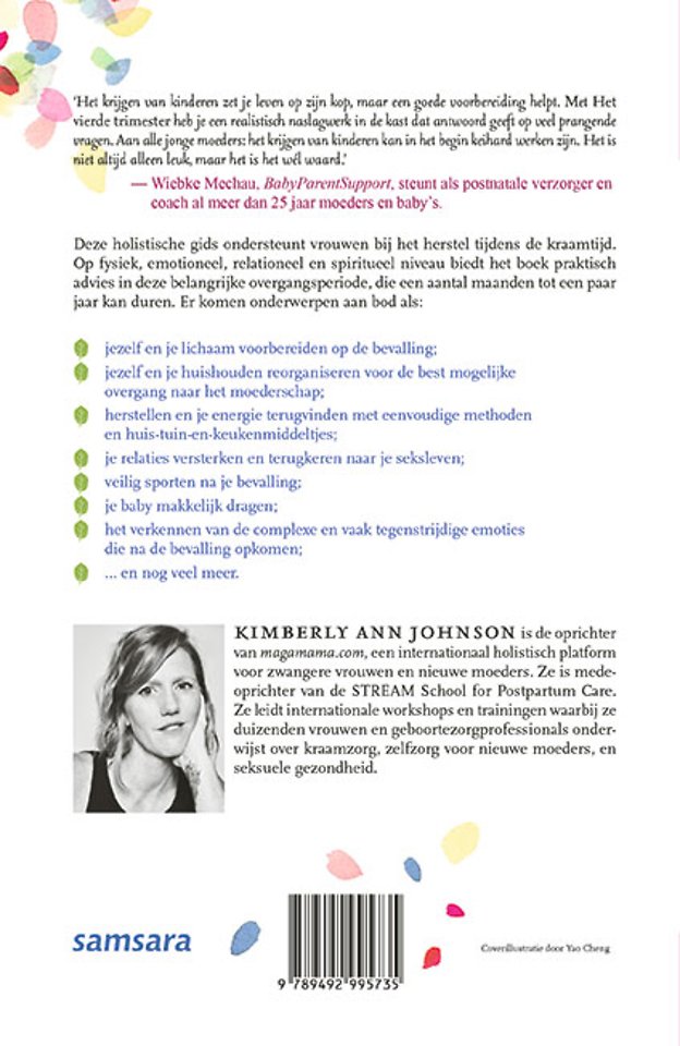 Deze eigentijdse en holistische gids biedt praktisch advies om vrouwen te ondersteunen bij het herstel tijdens de kraamtijd op fysiek, emotioneel, relationeel en spiritueel niveau. Het boek geeft vrouwen een stappenplan voor deze belangrijke overgangsperiode. Naast haar eigen ervaringen baseert Kimberly Ann Johnson zich op de helende tradities van Ayurveda, traditionele Chinese geneeskunst en kruidengeneeskunde.