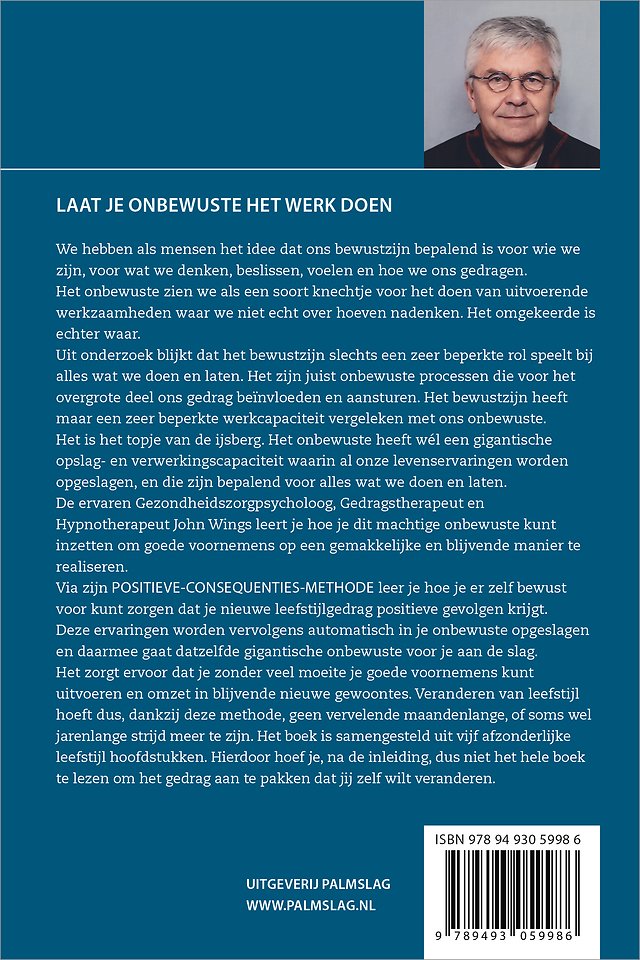 In dit boek van gezondheidszorgpsycholoog, gedragstherapeut en hypnotherapeut John Wings leren mensen daarom hoe ze ervoor kunnen zorgen dat hun goede voornemens beloond worden. Verder proberen mensen vaak veel te grote stappen te maken als ze hun gedrag willen veranderen en ook dat werkt niet. Kleine stapjes, die goed vol te houden zijn, werken veel beter om een doel te bereiken. Een ander belangrijk element is dat men leert hoe het ‘onbewuste’ kan worden ingezet als een hulpmiddel bij het realiseren van de goede voornemens. Hierdoor gaat het veranderen gemakkelijker en wordt nieuw en gezond gedrag al snel een nieuwe en blijvende gewoonte.