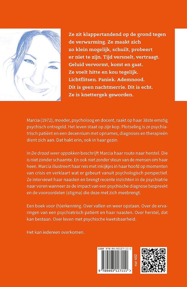 In De draad weer oppakken beschrijft Marcia haar route naar herstel. Die is niet zonder schaamte. En ook niet zonder steun van de mensen om haar heen. Marcia illustreert haar reis met inkijkjes in haar hoofd op momenten van crisis en verklaart wat er gebeurt vanuit psychologisch perspectief. Ze interviewt haar naasten en brengt recente inzichten in de psychiatrie naar voren wanneer ze de impact van een psychische diagnose bespreekt en de vooroordelen (stigma) die deze met zich meebrengt.