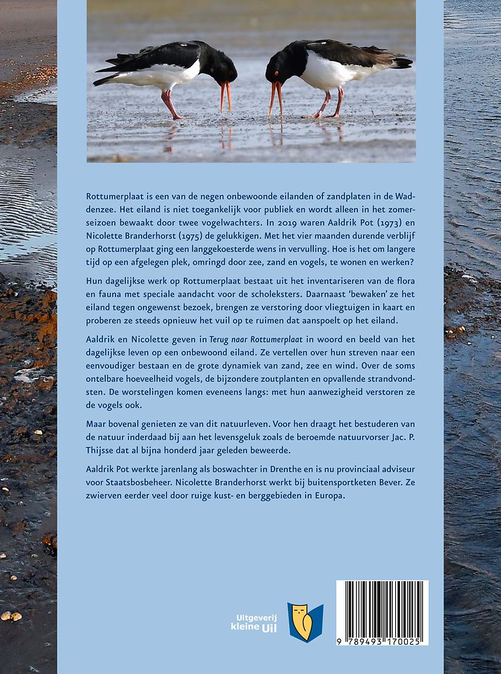 Aaldrik en Nicolette doen in Terug naar Rottumerplaat via woord en beeld verslag van het dagelijkse leven op een onbewoond eiland. Ze vertellen over hun streven naar een eenvoudiger bestaan en de grote dynamiek van zand, zee en wind. Over de soms ontelbare hoeveelheid vogels, de bijzondere zoutplanten en opvallende strandvondsten. De worstelingen komen eveneens langs: door hun aanwezigheid verstoren ze de vogels ook. Bovenal genieten ze van dit natuurleven. Voor hen draagt het bestuderen van de natuur inderdaad bij aan het levensgeluk, zoals de beroemde natuurvorser Jac. P. Thijsse dat al bijna honderd jaar geleden beweerde.