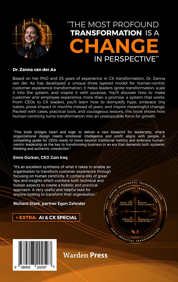 Based on her PhD and 25 years of experience in CX transformation, Dr. Zanna van der Aa has developed a unique three layered model for human-centric customer experience transformation. It helps leaders ignite transformation, scale it into the system, and inspire it with purpose. You’ll discover how to make customer and employee experience more than a promise: a system that works. From CEOs to CX leaders, you’ll learn how to demystify hype, embrace tiny habits, prove impact in months instead of years, and inspire meaningful change. Packed with cases, practical tools, and courageous lessons, this book shows how human centricity turns transformation into an unstoppable force for growth.