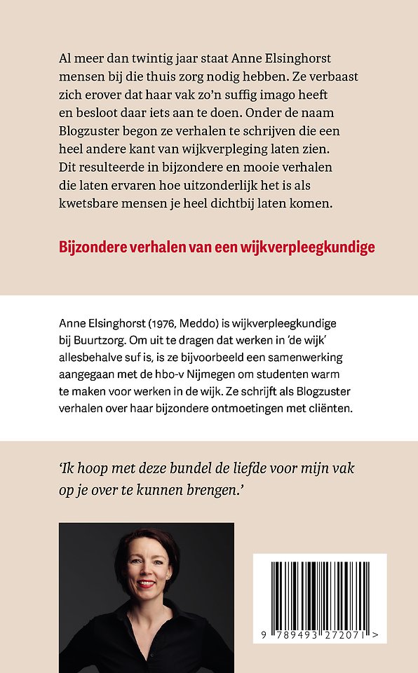Al meer dan twintig jaar staat Anne Elsinghorst mensen bij die thuis zorg nodig hebben. Ze verbaast zich erover dat haar vak zo’n stoffig imago heeft en besloot daar iets aan te doen. Onder de naam Blogzuster begon ze verhalen te schrijven die een heel andere kant van wijkverpleging laten zien.