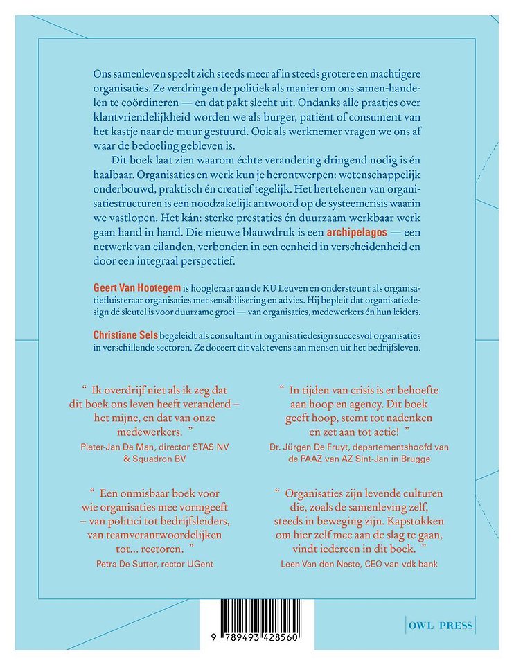 Dit boek laat zien waarom échte verandering dringend nodig is én haalbaar. Organisaties en werk kun je herontwerpen: wetenschappelijk onderbouwd, praktisch én creatief tegelijk. Het hertekenen van organisatiestructuren is een noodzakelijk antwoord op de systeemcrisis waarin we vastlopen. Het kán: sterke prestaties én duurzaam werkbaar werk gaan hand in hand. Die nieuwe blauwdruk is een archipelagos — een netwerk van eilanden, verbonden in een eenheid in verscheidenheid en door een integraal perspectief.