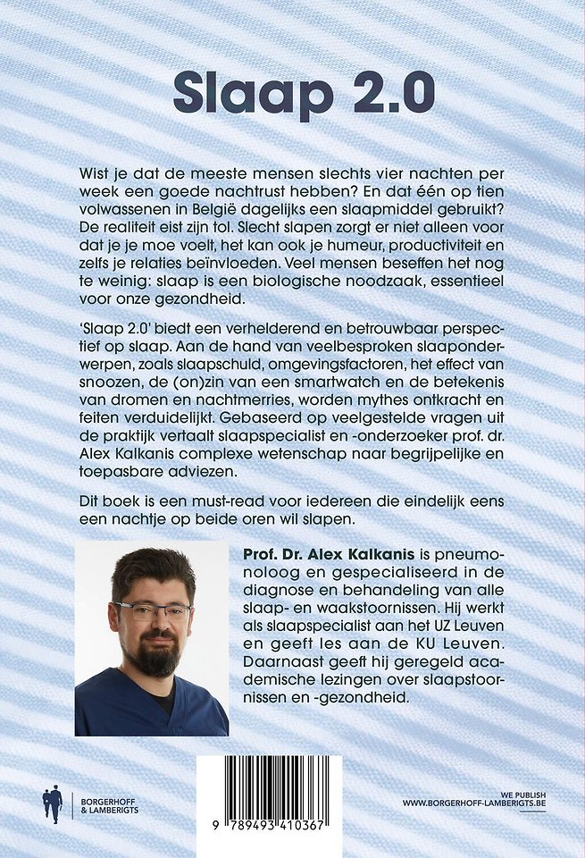 Slaapstoornissen zijn een groot probleem: in België heeft 1 op de 3 mensen wel eens last van slaapproblemen, en 1 op de 10 volwassenen gebruikt dagelijks een slaapmiddel – een van de hoogste aantallen in Europa. Ondanks de groeiende aandacht voor slaapgezondheid, is veel van de gedeelde informatie niet wetenschappelijk onderbouwd. Dit boek biedt een verhelderend en betrouwbaar perspectief op slaap. Aan de hand van actuele en veelbesproken slaaponderwerpen, zoals slaapregulariteit, social jetlag, omgevingsfactoren zoals lawaai en vervuiling, het effect van snoozen, en de invloed van voeding, beweging, dromen en nachtmerries, worden mythes ontkracht en feiten verduidelijkt. Gebaseerd op veelgestelde vragen uit zijn praktijk in het UZ Leuven, vertaalt prof. dr. Alex Kalkanis complexe wetenschap naar begrijpelijke en toepasbare adviezen. Dit bij momenten hilarische en pijnlijk herkenbare boek is bedoeld voor iedereen die eindelijk eens een nachtje op beide oren wil slapen.